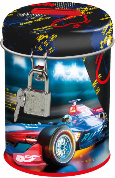 Autós persely, kerek, RT10, Race Team. Fém persely lakattal és kulccsal. Méret: 11x7,5cm