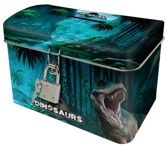 A Dinoszauruszos persely lakattal a dínók kedvelők számára készült. Szögletes alakja miatt, nem csak pénzt tárolhatsz benne, hanem más kisebb, értékes dolgokat is. A lakat nak és a hozzá tartozó kulcs nak köszönhetően legféltettebb kincseid biztonságban lesznek.